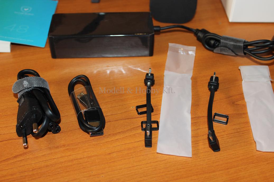 Ezen kívül találunk még a dobozban két darab kis fekete anyagból varrt rotorlapát tartót, benne rotorlapátokat, illetve, két fajta RC kábelt, USB-C típusú és mini USB-s kábelt is. Illetve van egy micro USB kábel a dobozban, mely a távirányító töltésére szolgál. (a 3. Fajta RC kábel a távirányítóba gyárilag be van dugva, Apple rajongók számára). A lényeg, hogy mindegy, hogy Android, vagy IOS-t futtató készülékünk van, van hozzá megfelelő kábel a dobozban.