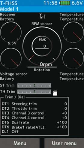 Először is, egy érintőképernyős, 10.9 cm átmérőjű TFT LCD színes kijelzőt találhatunk a távirányítóba építve, amire öröm ránézni, és nem mellesleg a legdurvább nyári napsütésben is kiválóan olvasható. Nyilván, a fényerő menüből állítható is. Mivel TFT panelről van szó, a legvadabb napsütésben is kiválóan látszik. Ez a nagyméretű kijelző jól átlátható felületet ad, könnyen olvashatóak le az egyes beállítási, üzemi paraméterek. A Futabától megszokott kényelmes, logikus felépítésű, érthető menük itt még szebbek és beszédesek a színes grafikáknak köszönhetően, így a kézikönyv nélkül is jól elboldogulunk majd a beállításokban. Nem kell nyomógombokkal szenvedni a navigálásban, az érintőképernyő könnyen használhatóvá teszi a menürendszert.