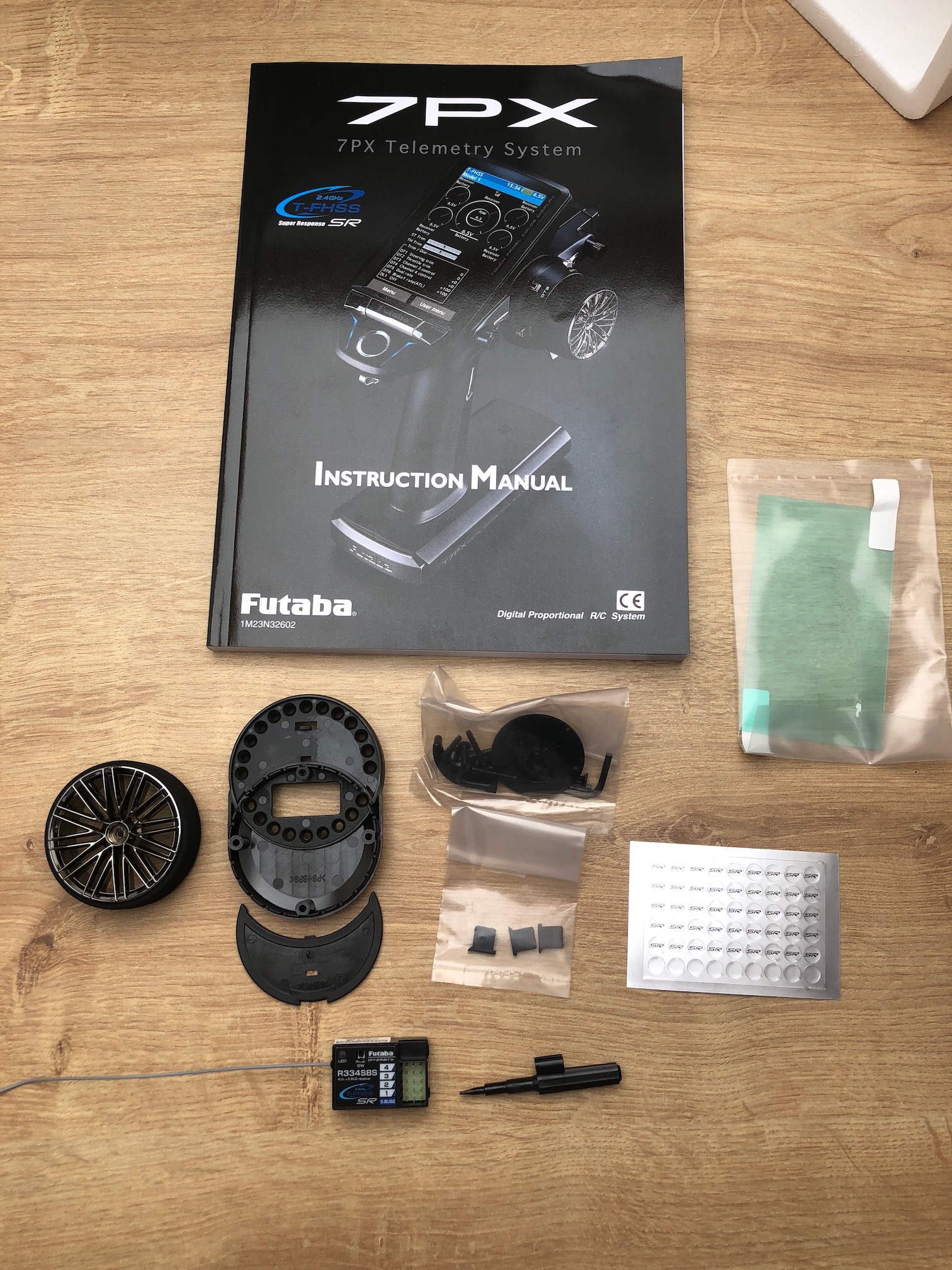a doboz tartalma: R334SBS vevő, APA adapter, nagyobb kormánykerék, gumi bevonattal, LCD kijelzőhöz védőfólia, mini csavarhúzó és használati utasítás.