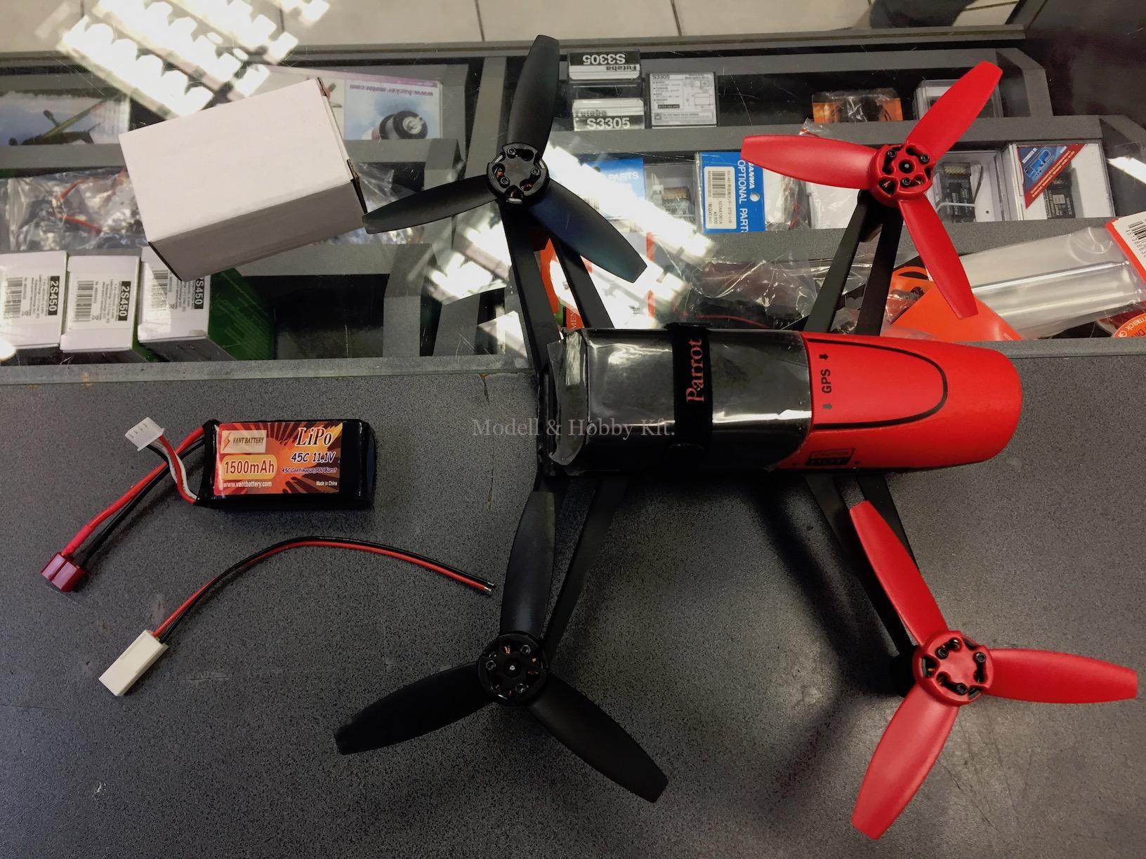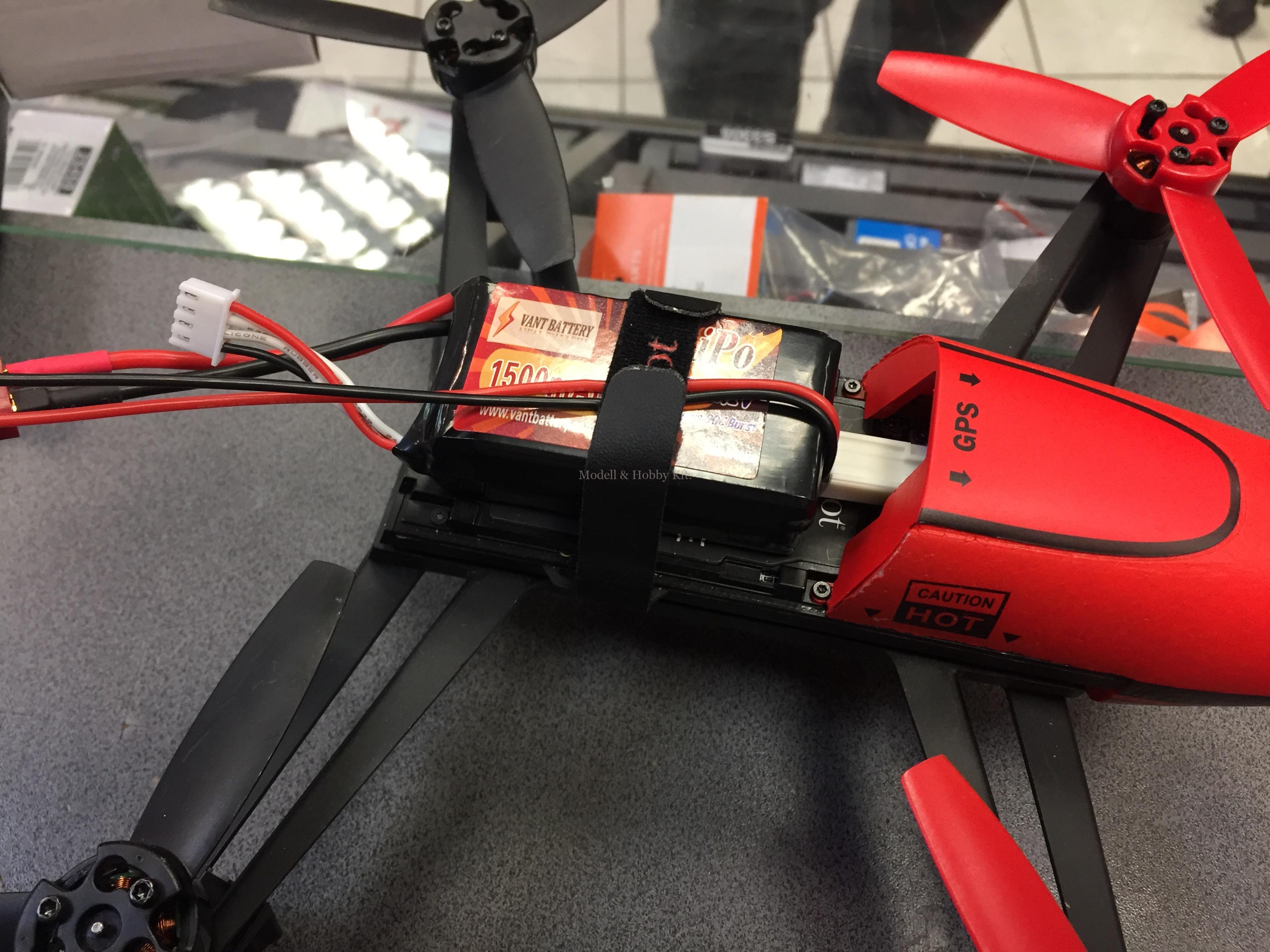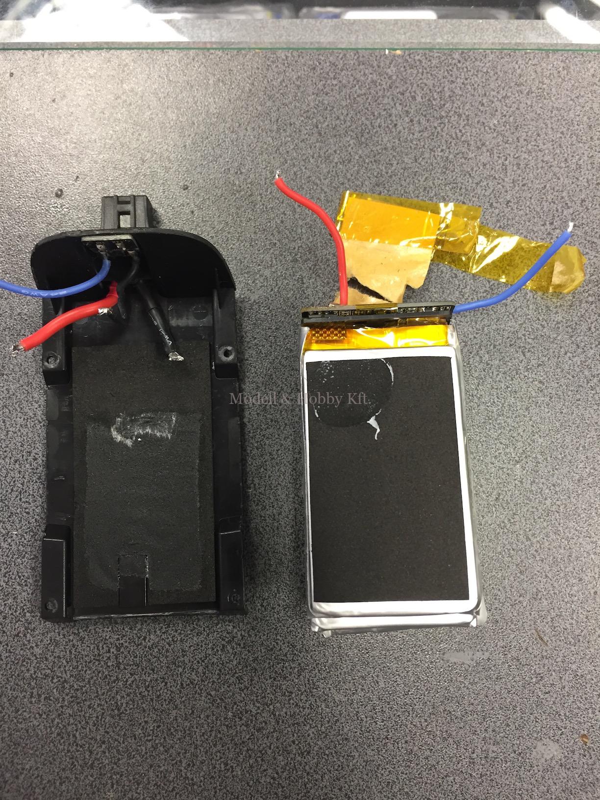 Gyári akkumulátor helyére pont elfér a VANT 3 cellás LiPo akksi, a drón csatlakozója egy Tamiya mini csatlakozó, ehhez kell egy csatit forrasztanunk az új LiPo akksi eredeti Dean csatija helyére és kész is van a mutatvány.