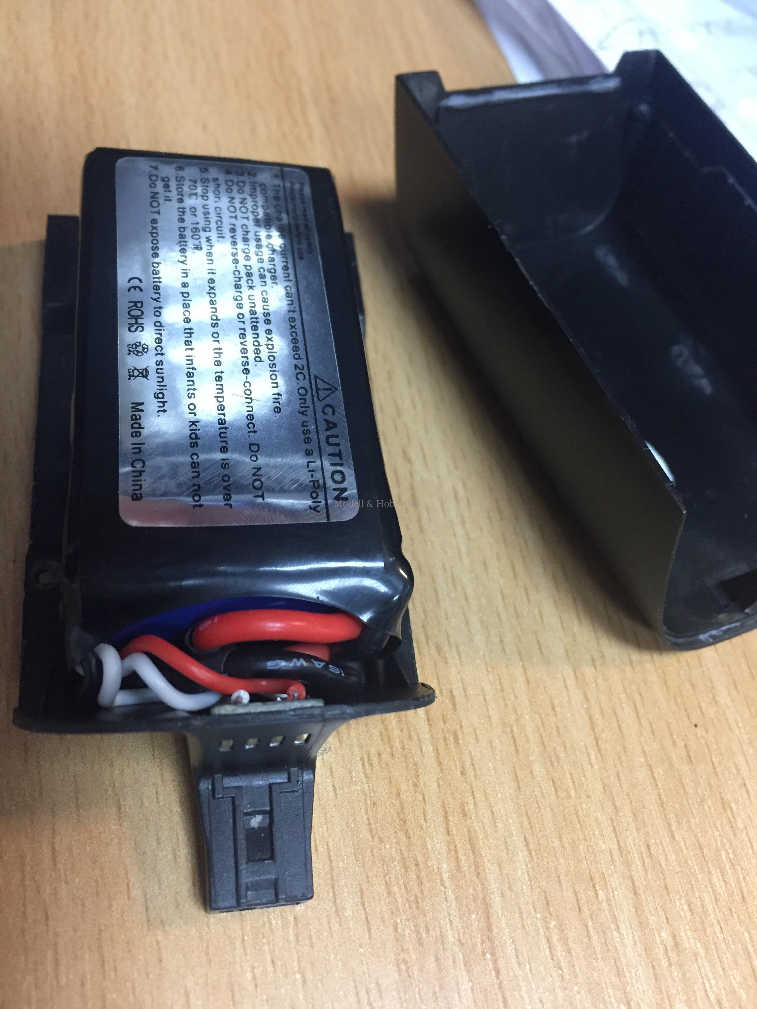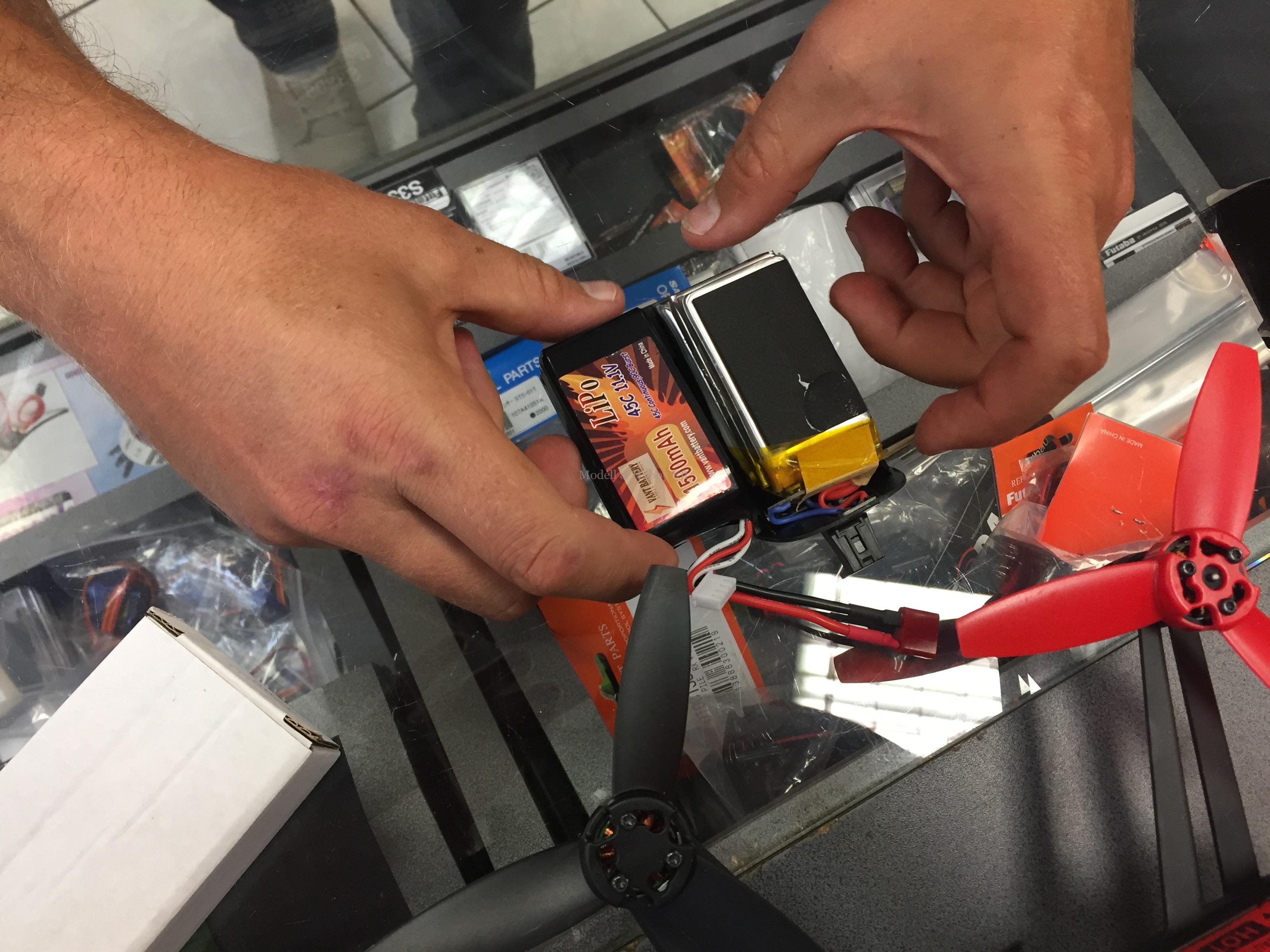 A 2. megoldásnál az jutott eszünkbe, hogy hanyagoljuk a gyári megoldást, és a modell hátára a gyári helyett egy sima 11.1V-os, 3 cellás LiPo akksit rögzítünk, egy csatlakozó forrasztás után gyakorlatilag készen is lettünk volna. Nagyobb kapacitás, olcsó akkumulátor, tökéletes megoldás. Igen ám, de modellező barátunk nem rendelkezik töltővel. Csak a gyári töltővel, de ezt az akksit azzal bizony nem tudja tölteni. Ergo ez egy olyan megoldás, ami szintén jó, de egy kis plusz beruházást igényel.